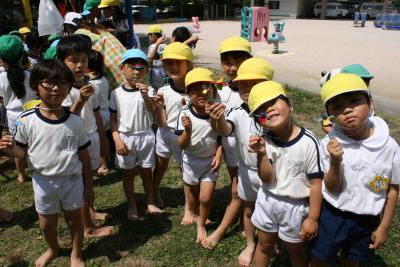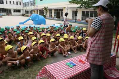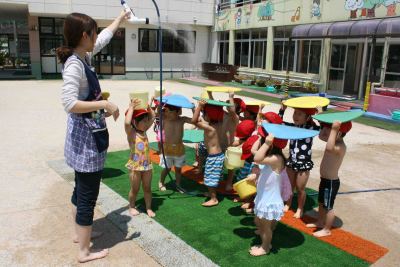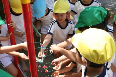 水ぐるま作り&水遊び 朝一番の自由遊びの時間に園長先生が年長さんに水車を作ってくださいまいました。 構造は至ってシンプル。針金とストローとビニールテープのみ。 水車ですが、息を吹きかけても「くるくる」と回るこのおもちゃ。 みんな大喜びで、できあがった後は、水を使って遊びました。 この日は、園内水遊びの備えて水着のお着替え練習でしたが、結構暑かったので そのまま運動場でひと遊び。 練習のはずでしたが、水あそびもしました。 年中さん、年少さんたのしかったね。