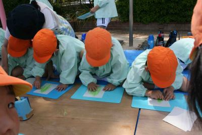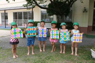 染め紙あそび つき組さん(年長)は、染め紙をしました。 この日は、水着の着替えの練習もしていたので、水着のまま園庭へ。 暑かったので水着でちょうどよい気温の下、みんなで取組みました。 折りたたんだ和紙の4つの角に、子供たちが選んだ色水をつけます。 この和紙を広げると、きれいな柄がでてきます。 この染め紙は、後日何かに変身します。保護者のみなさん、お楽しみに。