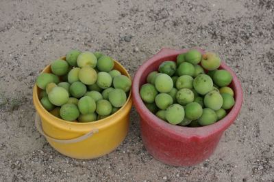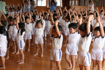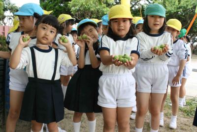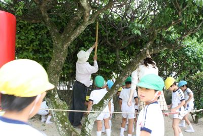 梅拾い 幼稚園には、いろんな樹木が植えてありますが、梅もそのひとつ。 毎年、きれいに花を咲かせていたのですが、 今年は、例年になく、たくさんの梅の実がなりました。 さっそく、高いところに実がなっていて手が届かないので、 園長先生が、棒などで、枝をゆさぶったりして、実を落としてもらいました。