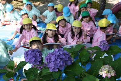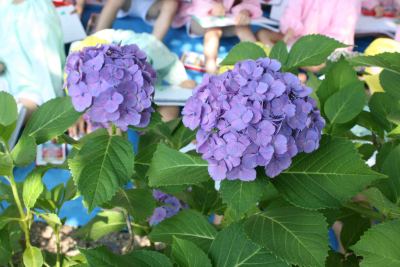 あじさいの写生 梅雨入りしたはずですが、良い天気が続いています。 せっかくのお天気続きでしたので、 年長さんは、運動場に咲いている「紫陽花」の写生をしました。 明後日は、参観です。このままお天気が続きますように。