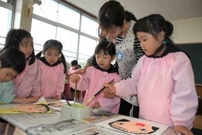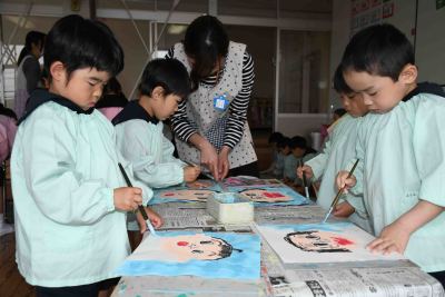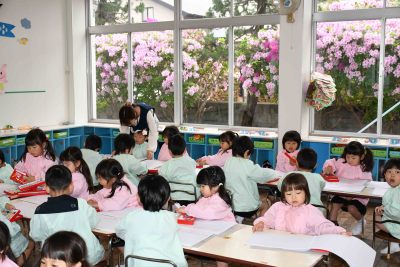 おかあさんの絵 ちょっと気が早いですが、幼稚園では、母の日に向けて お母さんの似顔絵描きです。 年長さんは、クレパスで描いた似顔絵の背景を 好きな色の絵の具で、背景塗り。 背景を塗ることも結構、大変なんですよ。 お母さま方、楽しみに待っていてくださいね。 今日の年中さんは、 クレパスを使っての線やいろいろな形の塗りの練習。 みんな上手に描いていましたよ。(まどの外のつつじがとってもきれいに咲いています)