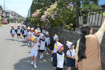 子どもたちは全員、お手製の「かぶと」をかぶってお集まり。